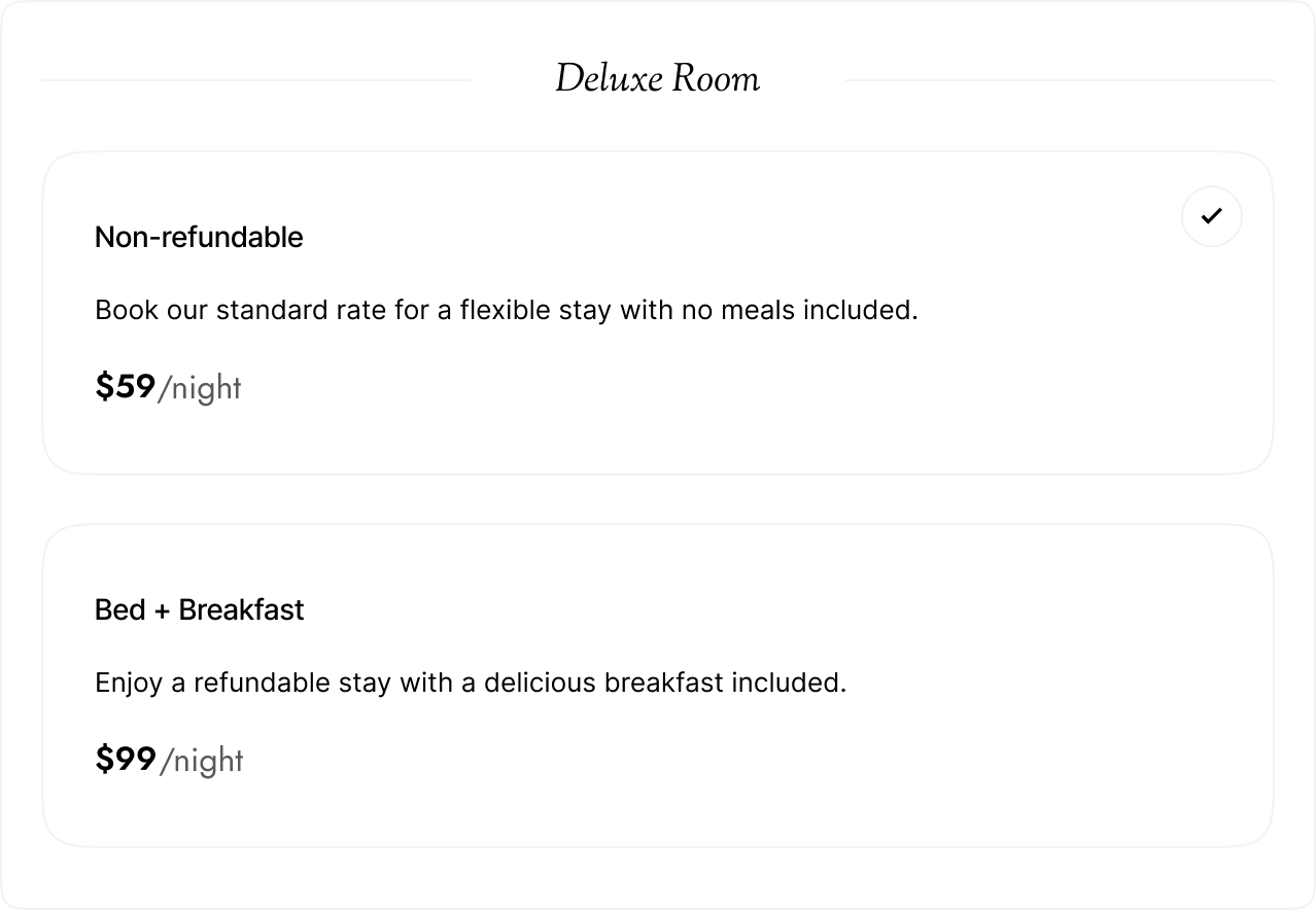 Offer flexible rate types—such as refundable, non-refundable, or promotional rates—individually for each room.