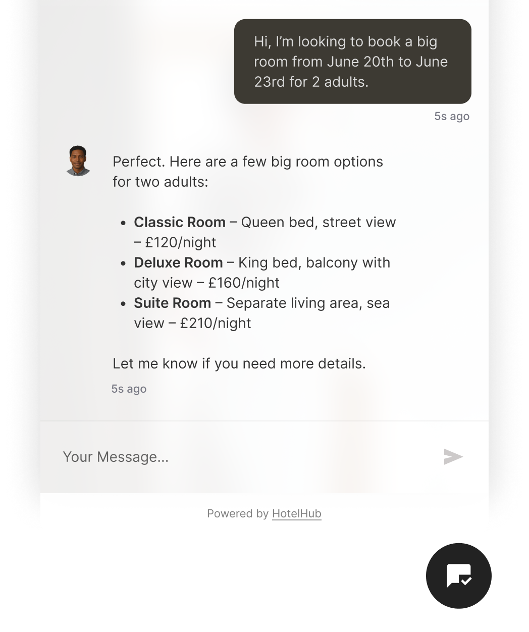 HotelHub’s intelligent AI system guides guests through every step—automatically identifying their needs, suggesting available rooms, and managing complex booking scenarios with ease.