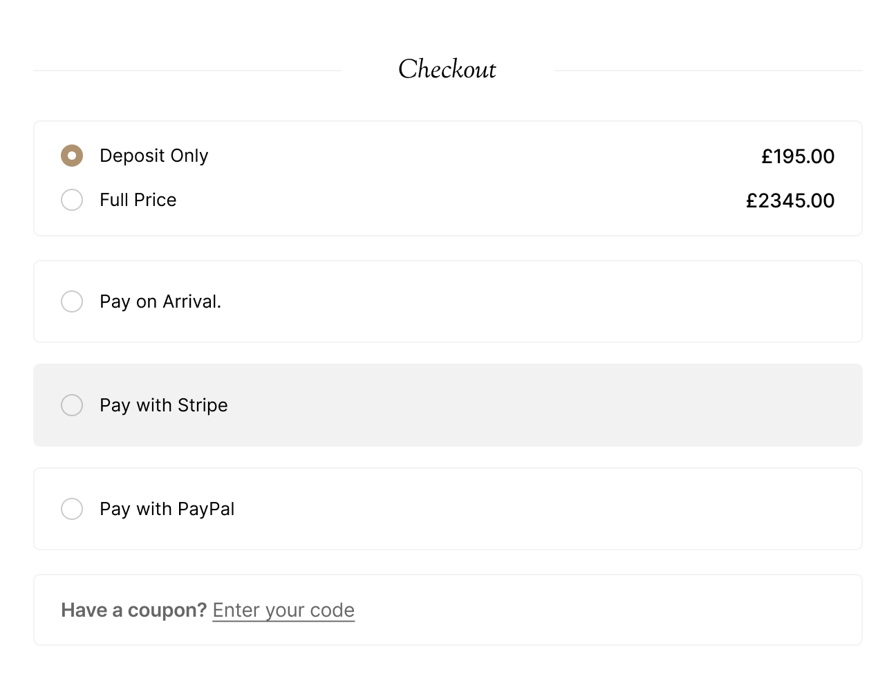 Use the built-in reservation system or switch to WooCommerce to handle the checkout process.