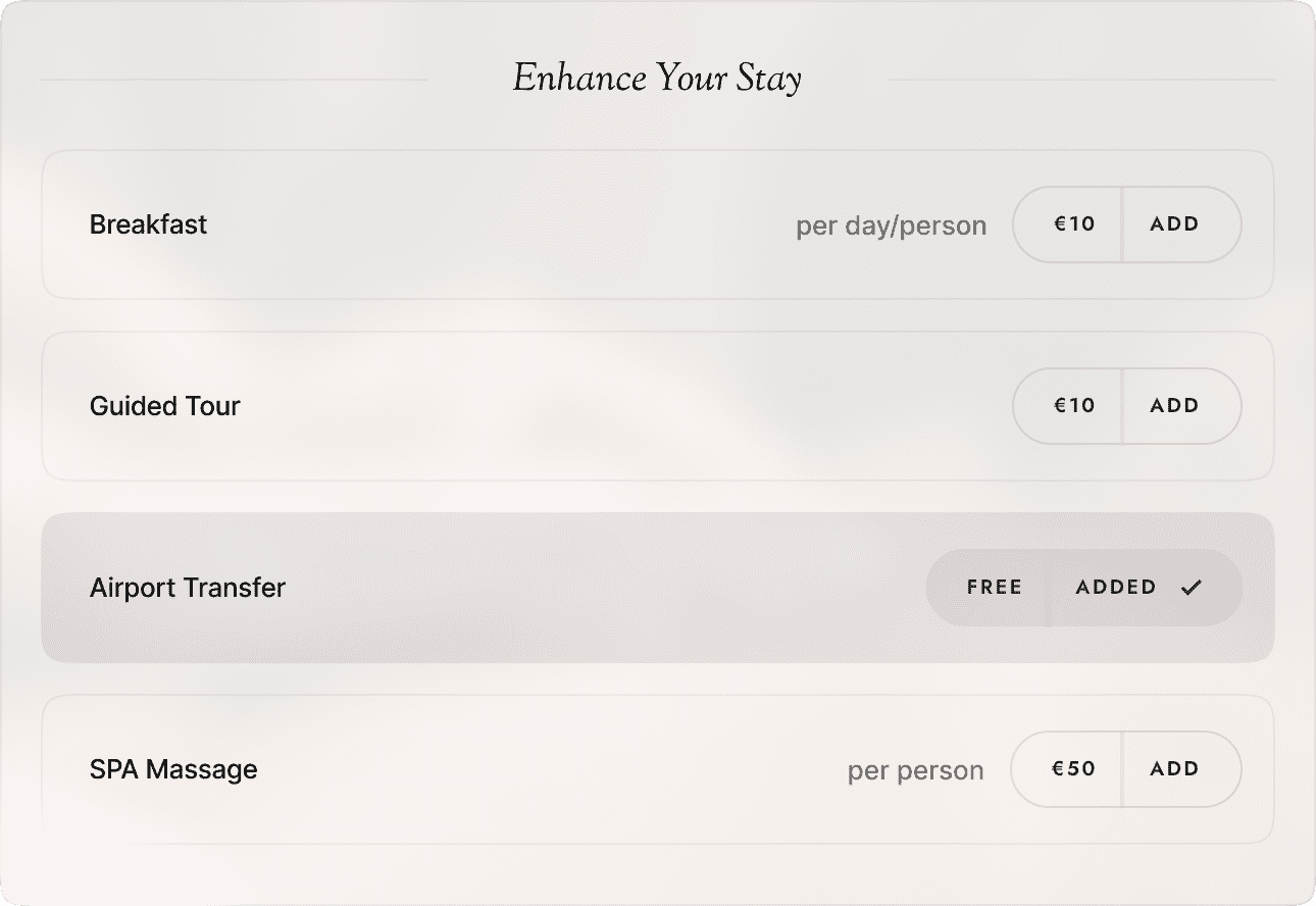 Easily add and manage optional extras such as breakfast, massages, or airport pickups. Set pricing per person, per day, as a one-time fee—or offer them for free. Whether it's a daily breakfast or a one-time spa treatment, HotelHub gives you full control over how extras are configured, helping you enhance the guest experience while increasing revenue.
