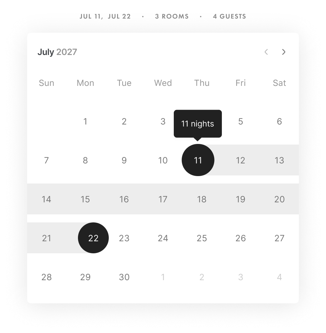 HotelHub enables your guests to book multiple rooms, with dynamic capacity and real-time price calculations.